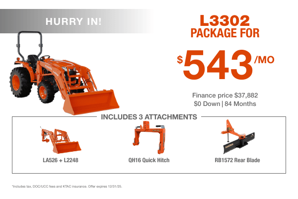 $0 down, 5.99% A.P.R. financing for 84 months on purchases of new Kubota L02 Series equipment from participating dealers. Example: 84 monthly payments of $37.88 per $1,000 financed. Example amount based on suggested retail sales price of $37,881.77 of the L3302 Series equipment with QH16 Quick Hitch, RB1572-82 72" Rear Blade, L3139 CCV Heater Kit, LA526/L2248 Loader/bucket and includes DOC/UCC fee, KTAC and tax. Eligibility must be verified. Each dealership sets its own price. Prices and payments may vary. Additional add-on packages are available on a selection of equipment from participating dealers; in-stock inventory is available to qualified purchasers through Kubota Credit Corporation USA; subject to credit approval. Implements are optional. Terms subject to change. Offers expire 12/31/25. This material is for descriptive purposes only. Kubota disclaims all representations and warranties, express or implied, or any liability from the use of this material. For complete warranty, disclaimer, safety, incentive offer and product information, consult your Dealer or KubotaUSA.com.